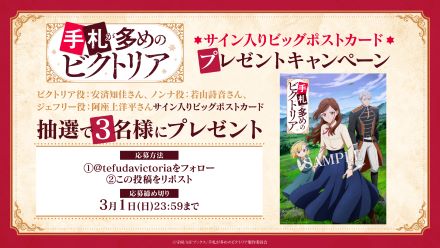 アニメ公式Xをフォロー&該当の投稿をリポストした方を対象に、ビクトリア・セラーズ役・安済知佳、ノンナ役・若山詩音、ジェフリー・アッシャー役・阿座上洋平サイン入りティザービジュアルポストカードを3名様にプレゼントされる。